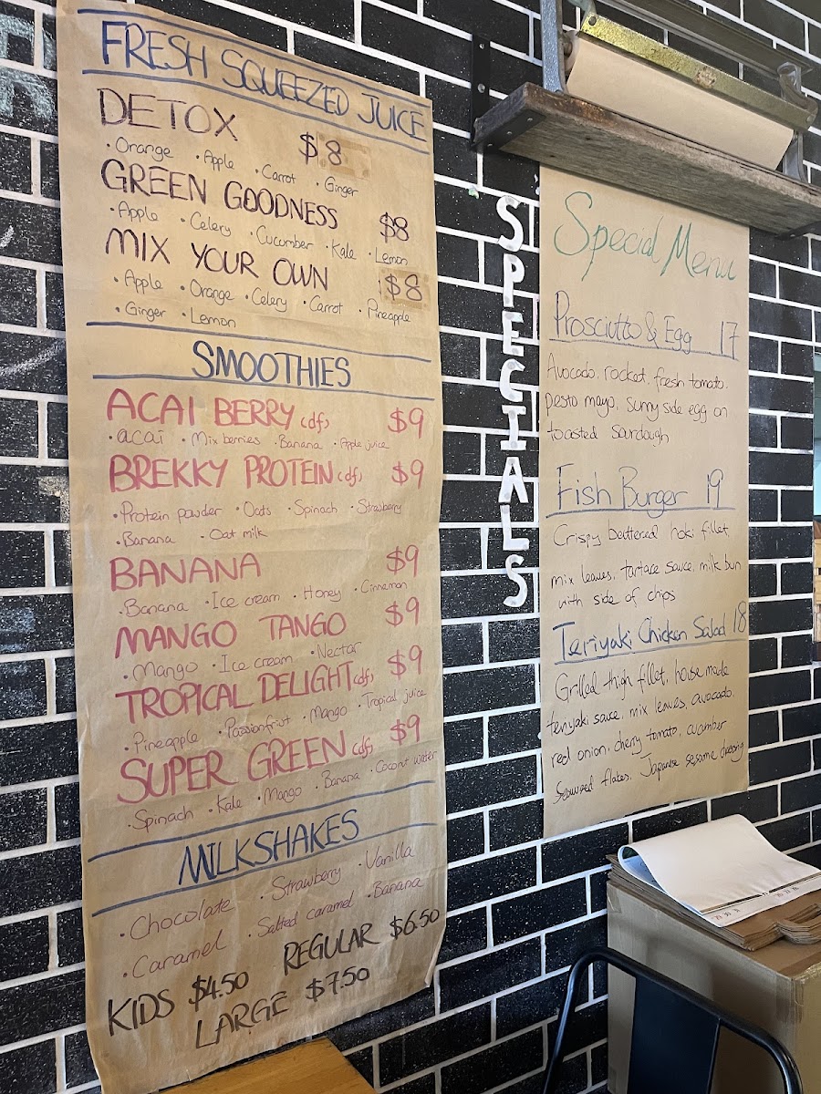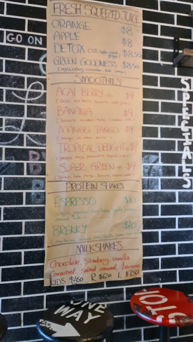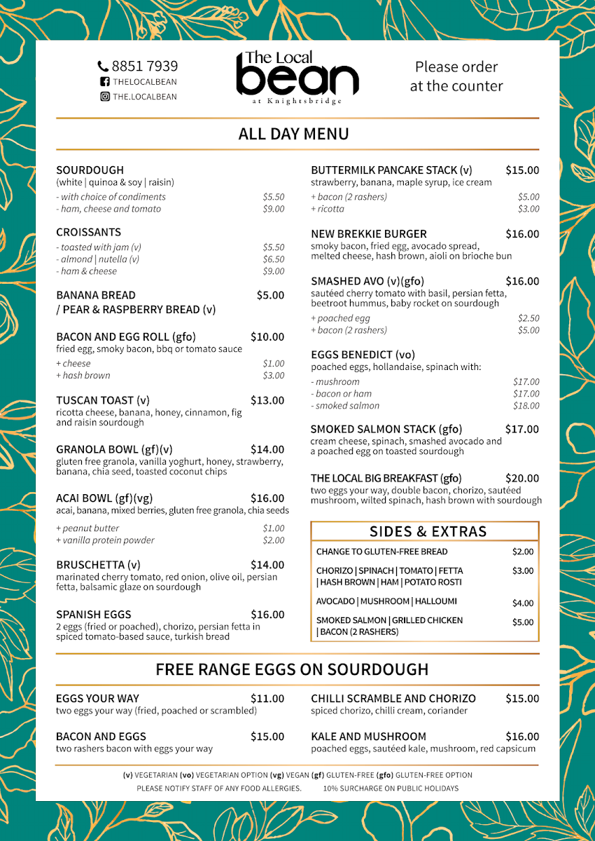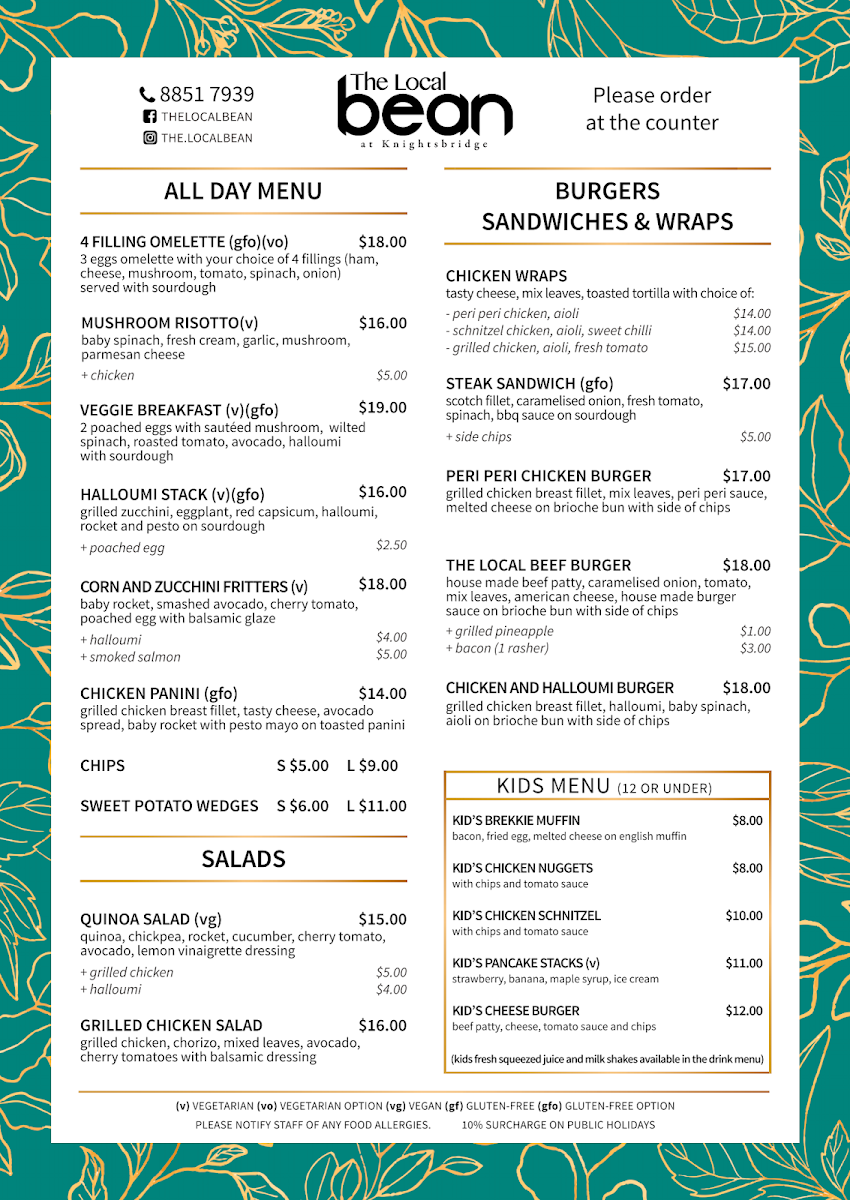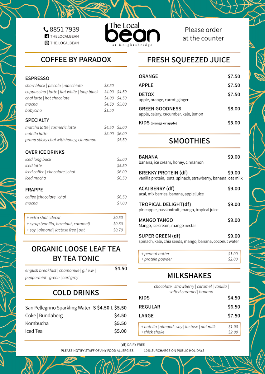 At The Local Bean At Knightsbridge, the menu strikes a careful balance between hearty breakfast options, wholesome meals, and indulgent treats. For a satisfying start, diners can choose from 4 Filling Omelette, Mushroom Risotto, Veggie Breakfast Chips, or the savory Halloumi Stack. The salad offerings, like Quinoa Salad and Grilled Chicken Salad, are fresh and filling, while the burgers, sandwiches, and wraps-including Chicken Wraps, Steak Sandwich, Peri Peri Chicken Burger, The Local Beef Burger, and Chicken and Halloumi Burger-cater to both casual lunches and indulgent cravings. Young guests are well looked after with the kids menu featuring Kid's Brekkie Muffin, Kid's Chicken Nuggets, Kid's Chicken Schnitzel, Kid's Pancake Stacks, and Kid's Cheese Burger. Beverage options are equally diverse, from classic espresso drinks like Short Black, Cappuccino, and Chai Latte to specialty creations such as Matcha Latte, Nutella Latte, and Prana Sticky Chai with Honey and Cinnamon. For cooler days, the iced drinks menu-including Iced Long Black, Iced Latte, Iced Coffee, and Iced Mocha-and frappes like Mocha provide refreshing alternatives. Health-conscious choices abound with San Pellegrino Sparkling Water, Coke, Kombucha Iced Tea, and fresh-squeezed juices like Orange, Apple, and Detox Green Goodness. Smoothies such as Banana, Acai Berry, Tropical Delight, Mango Tango, and Brekky Protein round out the options, alongside free-range egg dishes like Bacon and Eggs, Eggs Your Way, Chilli Scramble and Chorizo, and Kale and Mushroom. With sides and extras including Chorizo, the menu at The Local Bean At Knightsbridge offers something for every taste and time of day, making it a versatile spot for breakfast, lunch, or a leisurely coffee break.